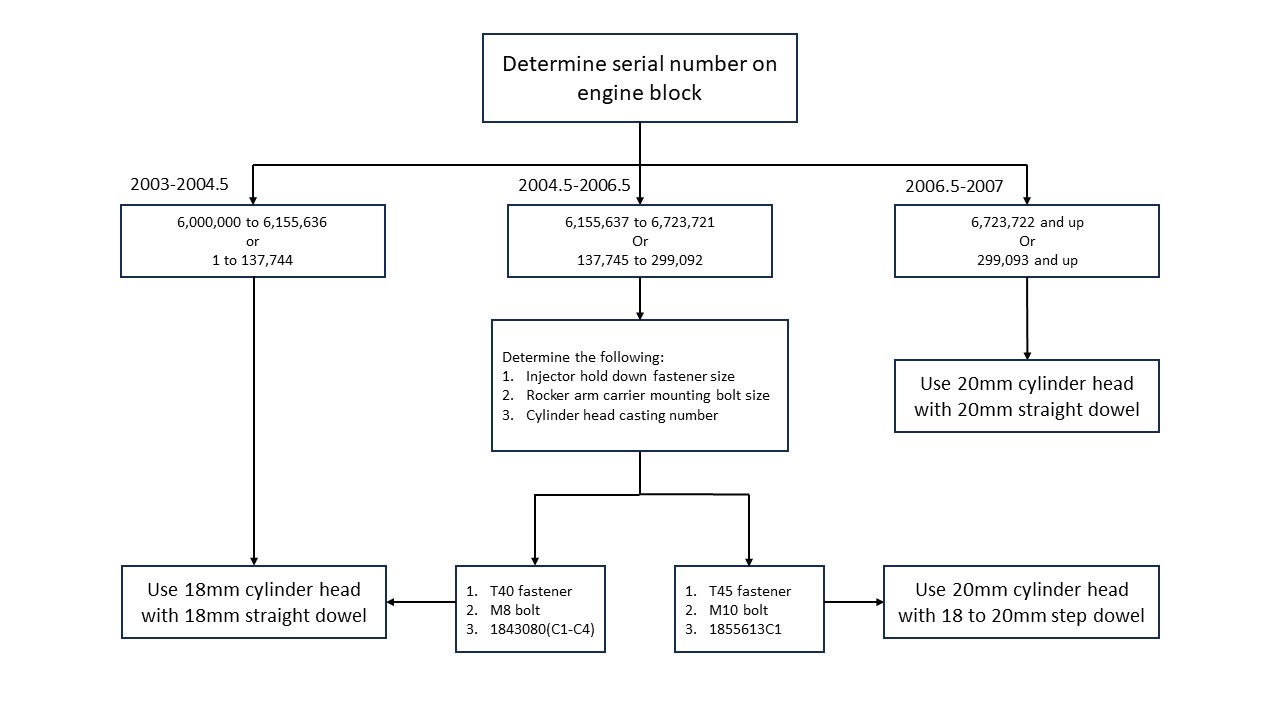 Follow the flow chart below to determine the appropriate cylinder head and components for your application (this information may also be found in our installation instructions). The engine serial number can be found on the rear, driver’s side of the engine block. An alternate location for the engine serial number can be found on the identification sticker located on top of the fuel injector control module (FICM). This only applies for vehicles with their original FICM. If you are unsure if the FICM is original to the vehicle, read the serial number on the back of the engine block.