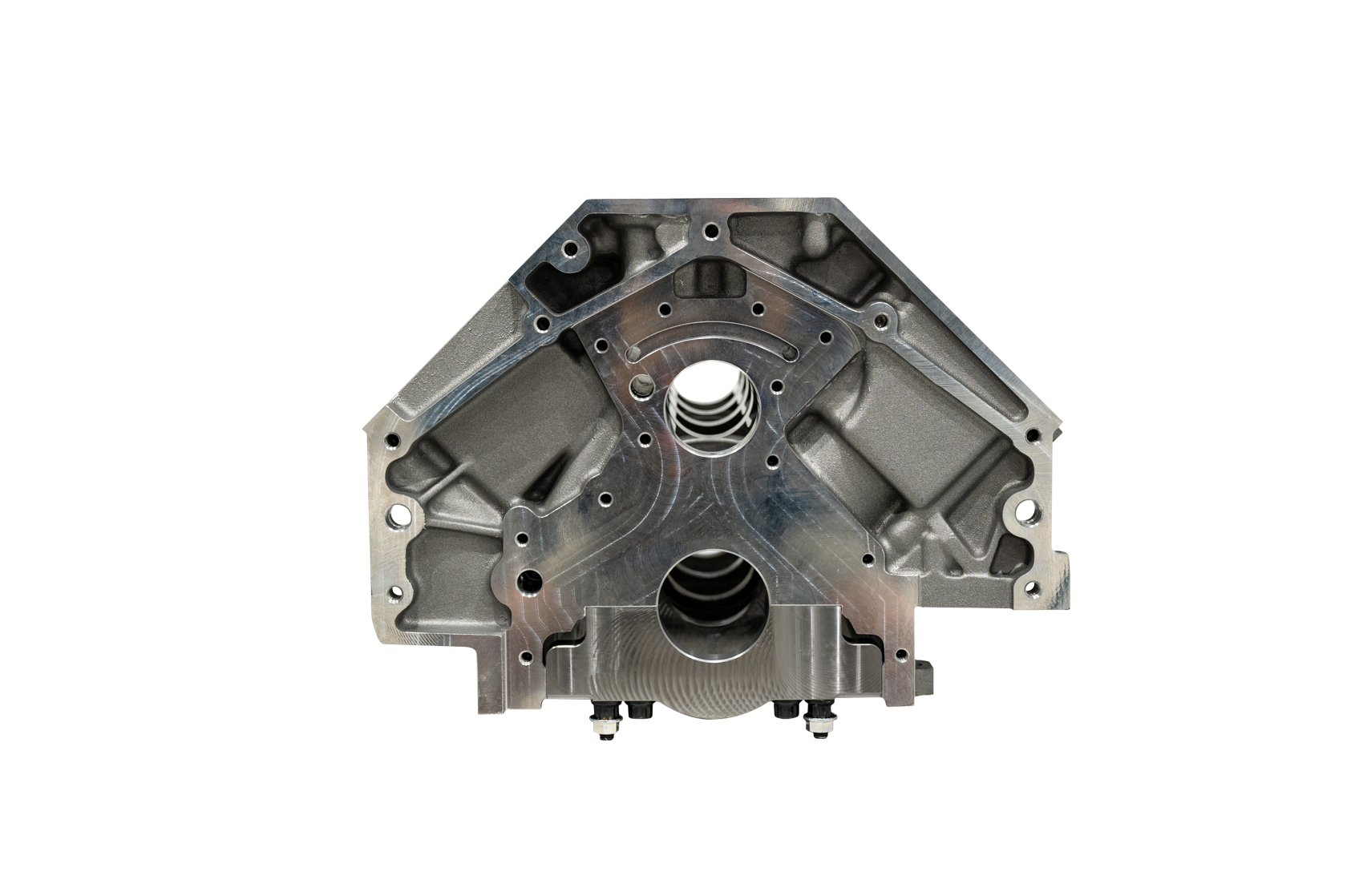 The camshaft and lifter bores are finish machined and ready for precision bearings and lifters.